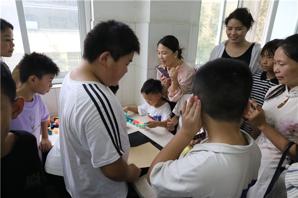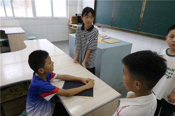 在校園中,孩子們一起相互交流。學校的學生們給新朋友介紹自己的學習生活,帶他們學習感受簡單的手語、扎寫盲文等,堅強的殘疾學生們讓初次來到這里的孩子和家長們深受觸動。