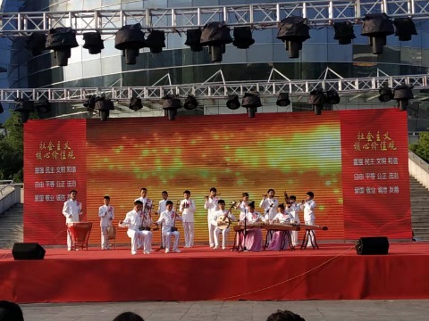2019年9月21日,由音體組部分志愿者,帶領(lǐng)學(xué)校視障學(xué)生民樂(lè)團(tuán)和聽(tīng)障學(xué)生舞蹈隊(duì),參加由市委宣傳部、文明辦舉行的弘揚(yáng)社會(huì)主義核心價(jià)值觀系列廣場(chǎng)演出。