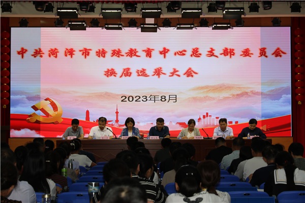 2023年8月28日下午,中共菏澤市特殊教育中心總支部委員會換屆選舉大會在學校多功能室召開,選舉產生了新一屆黨總支委員會。會議由原黨總支副書記張士良同志主持,邀請中共菏澤市委教育工作委員會辦公室霍金鎖同志、王百世同志到場指導監(jiān)督。