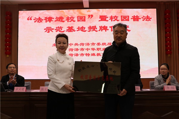 為增強同學們的法制觀念和自我保護意識, 10月30日上午,中共菏澤市委統(tǒng)戰(zhàn)部、菏澤市中華職教社走進菏澤市特殊教育中心聯合開展“法律進校園”活動,并舉行了校園普法示范基地授牌儀式。