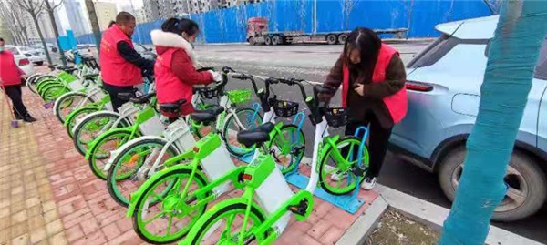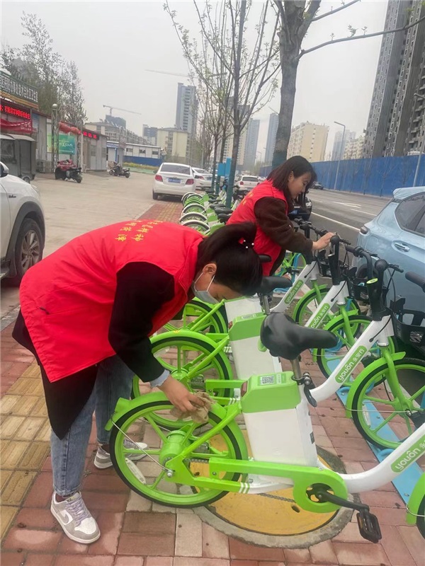 一排排便民公共電動車,為出行的人們提供方便,可是歪歪扭扭的排列,讓它們顯得那么不和諧,公共電動車上布滿灰塵,讓車身的綠色顯得黯然失色。音體組全體成員分工明確,積極擦拭電動自行車,希望它們未來的主人可以干凈出行。