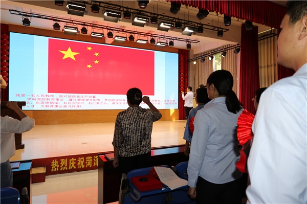 本次大會由學(xué)校副校長張海濱主持,大會正式開始,嘹亮的國歌奏罷,全體教師面對鮮艷的五星紅旗,肅穆而立,高舉右拳,莊嚴(yán)地進行宣誓。
