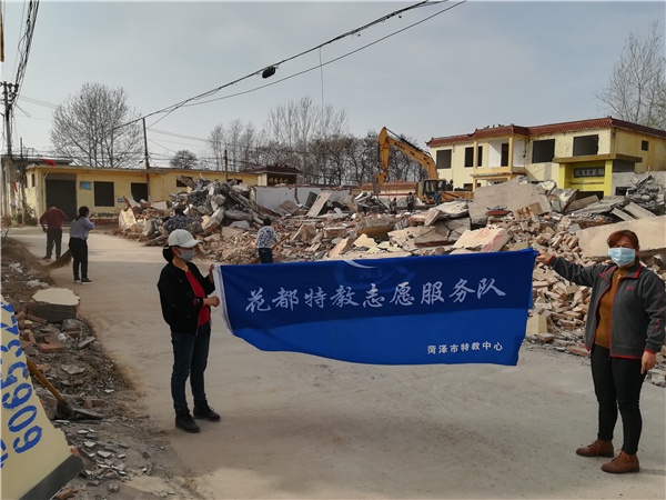 菏澤市特教中心“花都特教志愿服務(wù)隊”清掃廢墟中的小路