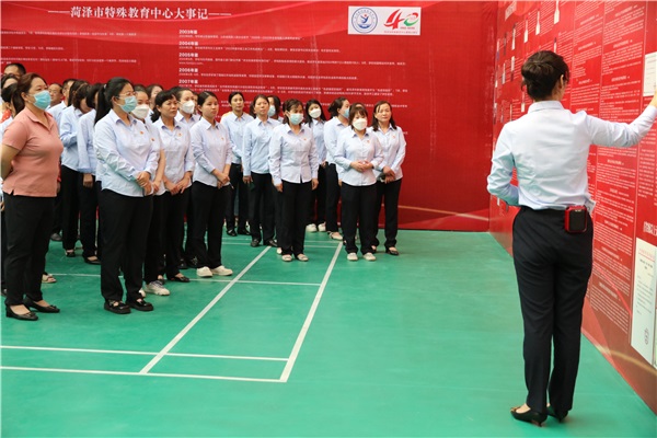 展廳是我校發(fā)展歷程的縮影和真實寫照,是我校文化傳承的象征。其內容以“櫛風沐雨四十載 春華秋實果滿枝”為主題,在講解員的引導下,全體黨員同志依次參觀了學校簡介、校訓、學校發(fā)展史、大事記、優(yōu)秀畢業(yè)生及其榮譽等內容展板,從初創(chuàng)階段、成長階段、快速發(fā)展階段和優(yōu)質發(fā)展階段四個時期,系統(tǒng)回顧了在黨和國家特教政策的大力支持下,隨著學校黨組織的發(fā)展壯大,菏澤市特殊教育中心四十年來的艱辛歷程和斐然成就。通過聆聽講解,大家深入了解了菏澤市特殊教育中心既厚重又充滿活力的歷史,被長期以來特教教師艱苦育人的精神所感動,更為我校歷任領導和老師們?yōu)樘厥饨逃聵I(yè)發(fā)展所作出的貢獻感到自豪,為學校歷屆畢業(yè)生所展現出來蓬勃、自信、自強的精神面貌而感到驕傲。