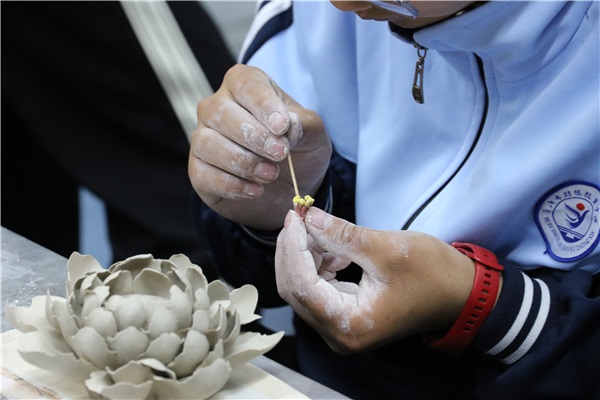 比賽正式開始,同學(xué)們雙手捻起瓷泥,熟練地揉捏出牡丹花瓣的形狀。牡丹花瓣組裝完最后一步是點(diǎn)花蕊,需要一層層、小心翼翼地?fù)荛_花瓣,輕輕地點(diǎn)上花蕊。噴釉的同學(xué)則一手緊托牡丹花,一手舉起噴槍讓花朵綻放出色彩。同學(xué)們經(jīng)過(guò)一上午的努力,成功制作出了一朵朵直徑不小于10厘米,花瓣數(shù)量不少于30瓣的牡丹花,花朵整體舒展、錯(cuò)落有致。經(jīng)過(guò)噴釉后的牡丹花顏色薄厚適中、過(guò)渡自然,更是充滿了神韻。