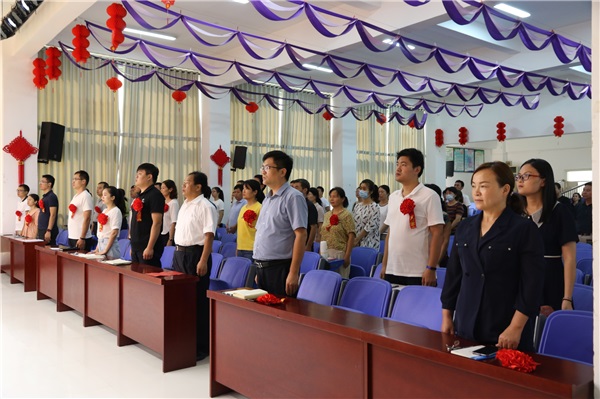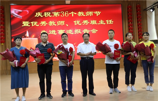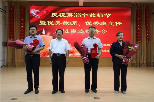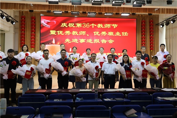 大會在莊嚴的國歌聲中拉開帷幕,全體教職工面對國旗進行宣誓,“忠誠黨的教育事業(yè),履行教師的神圣職責……”,老師們句句鏗鏘有力,道出了對教育事業(yè)的不變初心。隨后由黨總支委員蔡厚鎮(zhèn)同志宣讀本次的表彰決定,由校長毛丕顯同志對優(yōu)秀教育工作者、優(yōu)秀教師、優(yōu)秀班主任頒發(fā)證書并送上節(jié)日的鮮花。