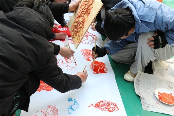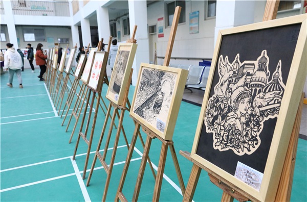 本次校園藝術(shù)節(jié)展出了泥塑、木雕、版畫、國畫、刻瓷等多種藝術(shù)形式作品,作品內(nèi)容也是豐富多彩。刻得精雕細(xì)琢,畫得栩栩如生,構(gòu)思巧妙,造型各異,每一件作品都充滿著學(xué)生豐富的創(chuàng)造力和想象力?;顒?dòng)還有精彩的現(xiàn)場創(chuàng)作部分,一條三十余米的長卷橫鋪在展覽區(qū)前方,聾部低年級到職業(yè)班的學(xué)生專注地在上面進(jìn)行創(chuàng)作,揮灑藝術(shù),前來參觀的師生不時(shí)地對他們豎起大拇指。純白的畫布在同學(xué)們的巧手下,變得五彩繽紛。雖無法用言語傳遞感情,但同學(xué)們用手中的畫筆描繪出了對新年的祝福,對祖國的贊美,對生活、對學(xué)校的熱愛。