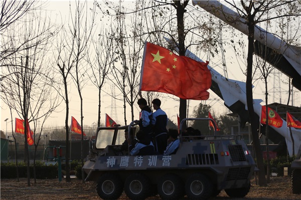 “來,孩子們上車!”教官開著一輛車帶著同學(xué)們體驗,坐在位置上的同學(xué)手里拿著鮮艷的五星紅旗,隨著車子的啟動,紅旗迎風(fēng)飄揚,成為陽光下最耀眼的一抹紅。