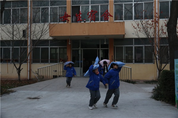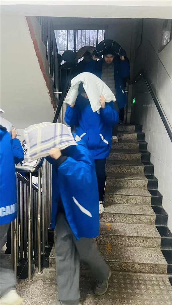 警報聲響,演練正式開始。宿舍樓里的同學們立即起床,就地進行應急避險,大家用枕頭保護住頭部,屈身坐在堅固物體旁。第二聲警報,教師們按照預定的疏散路線組織學生迅速、有序地離開宿舍樓向室外疏散集合點撤離。演練過程中,師生遵循“震時就地避險,震后迅速撤離”的應急避震準則,教師們各司其職、認真負責,同學們撤離有序、沉著冷靜,做到了無一人掉隊。