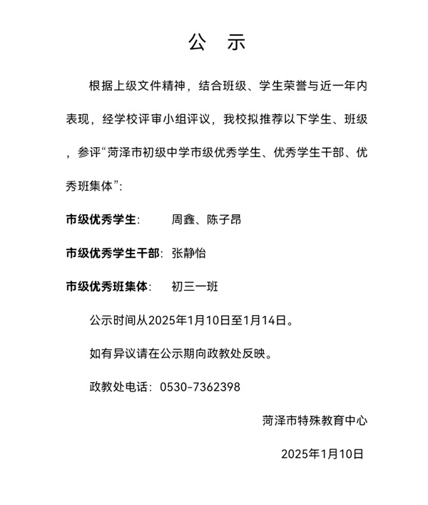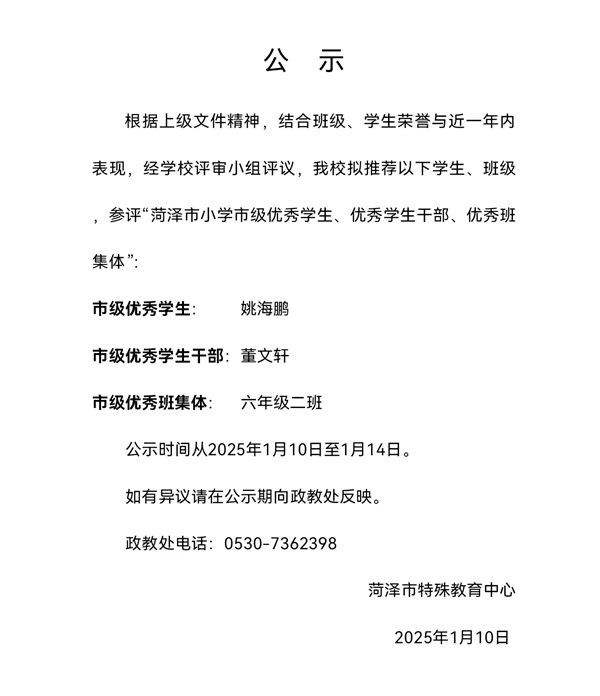 菏澤市特殊教育中心擬推薦市級優(yōu)秀學生、優(yōu)秀學生干部及優(yōu)秀班集體公示