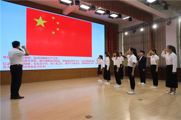 本次大會由黨總支副書記、工會主席張士良同志主持。嘹亮的國歌奏罷,進入新入職教師宣誓環(huán)節(jié)。面對鮮艷的五星紅旗,新入職的教師們肅穆而立,高舉右拳,在黨總支委員、副校長王懷寧同志的帶領下,莊嚴地進行宣誓。“忠誠黨的教育事業(yè),履行教師的神圣職責……”,字字鏗鏘有力,道出為教者的初心。