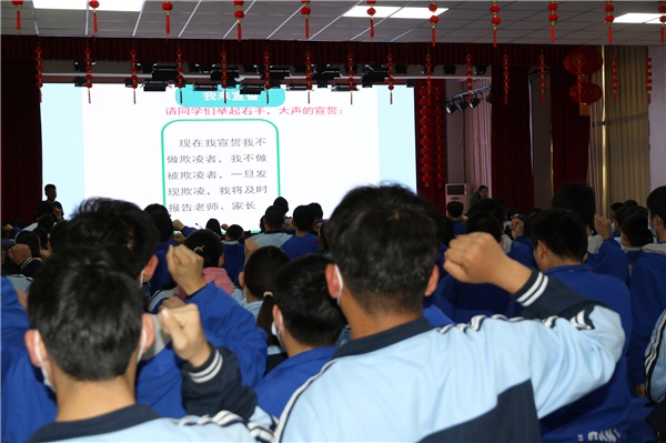 報告會結(jié)束,同學(xué)們集體觀看了《山東省校園防欺凌警示片》,視頻中一件件真實(shí)的欺凌案件,做到了以案釋法,讓同學(xué)們深受震撼的同時更加清楚地認(rèn)識到校園欺凌的危害。“我不做欺凌者,我不做被欺凌者,一旦發(fā)現(xiàn)欺凌,我將及時報告老師、家長……”在學(xué)校安全辦王沖老師的帶領(lǐng)下,全體學(xué)生鄭重宣誓。
