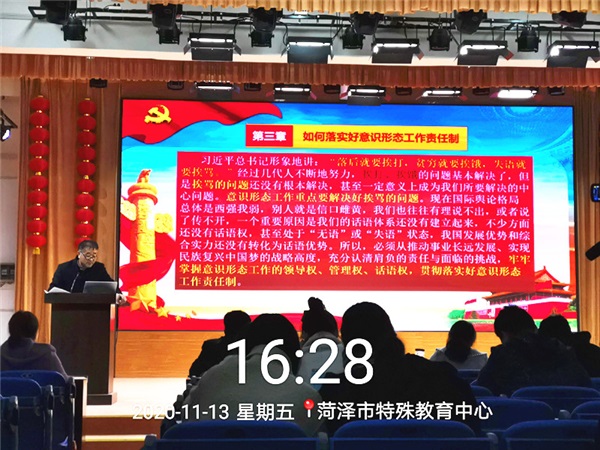 為深入學習貫徹習近平新時代中國特色社會主義思想,全面落實意識形態(tài)工作責任制,進一步樹牢“四個意識”,強化政治擔當。2020年11月13日下午,菏澤市特殊教育中心黨總支副書記張士良同志在三樓多功能室為全體黨員上了一堂《牢記使命 全面履行新時代意識形態(tài)工作責任制》的專題黨課。