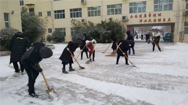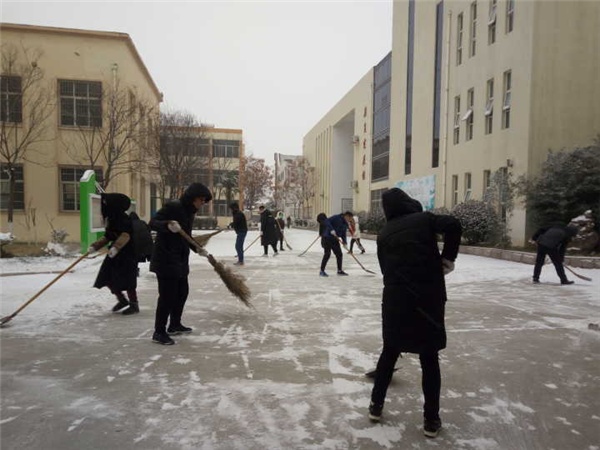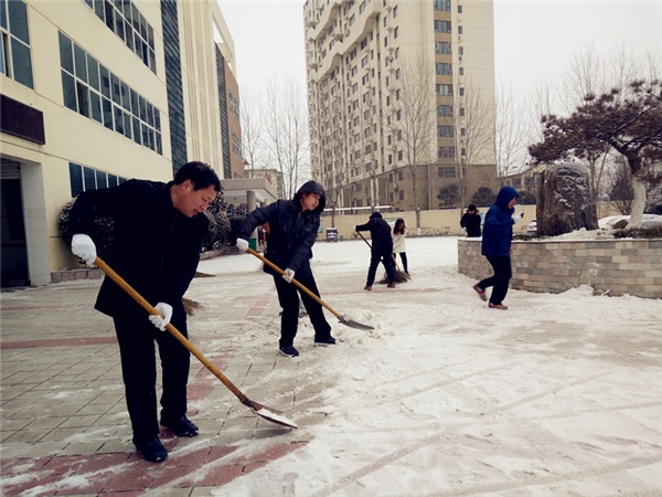 按照清掃積雪方案,教師們分工合作,有的拿鐵鍬、有的拿掃帚,積極主動的投入到掃雪的活動中。在大家的努力下,經(jīng)過近一個小時的勞動,教學(xué)樓前的道路及通往宿舍和餐廳路段的積雪全部清除干凈,為我校師生的出行提供了可靠保證,也為過往車輛和行人創(chuàng)造了一個安全的出行環(huán)境。