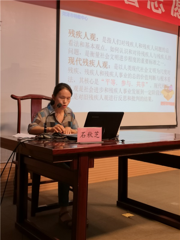 本次培訓(xùn)以“文化助盲志愿服務(wù)”為主題,分別就文化助盲志愿服務(wù)的社會意義、現(xiàn)代殘疾人觀、盲生的心理特點及導(dǎo)盲技巧、志愿服務(wù)助力盲人閱讀推廣等方面進(jìn)行培訓(xùn)授課。石秋芝老師從樹立文明的現(xiàn)代殘疾人觀 、盲生的心理特點及導(dǎo)盲技巧等方面做分享。趙娜老師從志愿服務(wù)助力盲人閱讀推廣方面做詳細(xì)的講解。