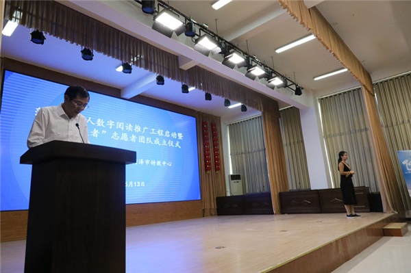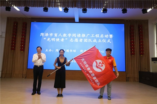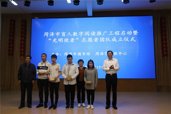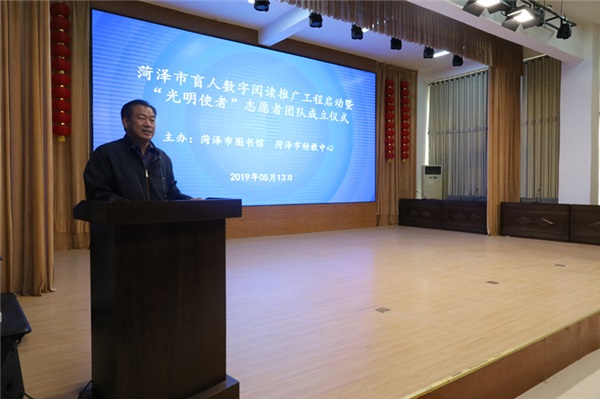 本次活動(dòng)共分兩項(xiàng),一是由菏澤市特教中心和菏澤市圖書館聯(lián)合承辦,菏澤市盲人數(shù)字閱讀推廣工程暨“光明使者”志愿者團(tuán)隊(duì)成立儀式在我校啟動(dòng)。首先是張朝永館長(zhǎng)為本次活動(dòng)致辭,他表示,菏澤市圖書館將持續(xù)為我校學(xué)子提供服務(wù),讓更多的特殊兒童也能享受到閱讀的快樂。接著張朝永館長(zhǎng)、呂曉娟副館長(zhǎng)為我校學(xué)生發(fā)放智能聽書機(jī)并為“光明使者”授旗,隨后毛校長(zhǎng)做了講話,首先對(duì)菏澤市圖書館近年來(lái)對(duì)我校的幫助表示衷心的感謝,同時(shí)激勵(lì)我校學(xué)子在學(xué)習(xí)課本知識(shí)之余,運(yùn)用現(xiàn)代化閱讀機(jī),廣泛閱覽圖書。
