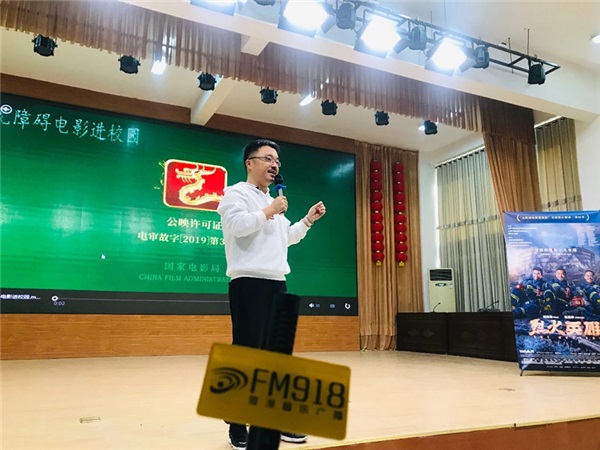 為慶祝第36個國際盲人節(jié),2019年10月15日下午,“無障礙電影進校園”全國愛心聯(lián)動(第四季)走進菏澤市特殊教育中心,學校全體盲生在三樓多功能室參與了這場視覺盛宴。本次活動為學生們帶了一部講述消防員故事的電影——《烈火英雄》,菏澤市廣播電視臺音樂廣播(FM91.8)主持人李子涵擔任本次活動的現(xiàn)場解說。通過主持人對影片精準的口語描述,精彩的講解,讓所有觀看影片的盲生沒有障礙地欣賞和理解影片。 FM91.8音樂廣播總監(jiān)楊通為學生們介紹本次活動 音樂廣播(FM91.8)主持人李子涵正在進行現(xiàn)場解說