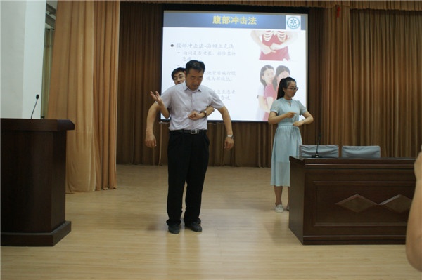 在課堂上,杜修生主任對(duì)燙傷、燒傷、異物堵塞喉嚨、踩踏事故、溺水窒息等進(jìn)行詳細(xì)講解。為讓學(xué)生認(rèn)識(shí)到急救知識(shí)的重要性,杜修生采用真實(shí)事件進(jìn)行舉例講述。為了讓盲聾啞學(xué)生理解并記住,市二院醫(yī)護(hù)人員用真人進(jìn)行現(xiàn)場(chǎng)模擬演示。學(xué)校的三位手語(yǔ)老師輪番在一旁進(jìn)行實(shí)時(shí)翻譯,讓聾啞學(xué)生看得懂、讓盲生聽得明白,大家都受益匪淺。