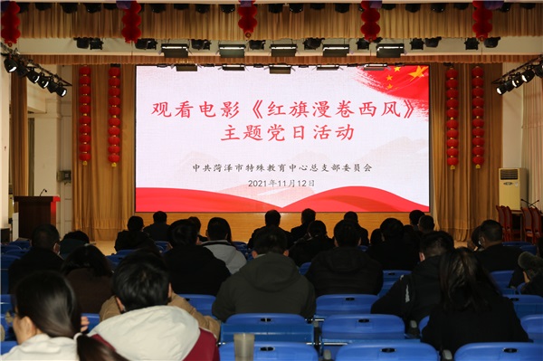 為進(jìn)一步推動(dòng)我校黨史學(xué)習(xí)教育走深走實(shí),引導(dǎo)廣大黨員干部重溫紅色歲月,緬懷革命先烈,傳承紅色基因,堅(jiān)定理想信念,根據(jù)上級文件要求,2021年11月12日下午,菏澤市特殊教育中心黨總支在多功能室開展主題黨日活動(dòng),觀看中共黨史教育文獻(xiàn)紀(jì)錄電影《紅旗漫卷西風(fēng)》,全體黨員教師共90余人參加。